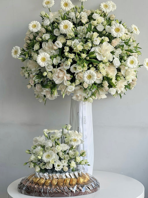Cylinder brown box filled with 800 grams of chocolates with fresh flowers. size: 30cm x 30cm
