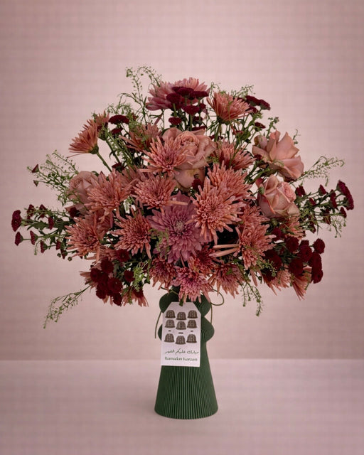Fresh flower arrangement on a green plastic vase along with Ramadan tag. Approximate Size: