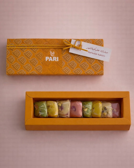 Our Finyal Small box filled with 8 pieces Sesame white Chocolate Rose, Rose Croquant, Saffron Pistachio Croquant or 4 pieces of premium coated date...