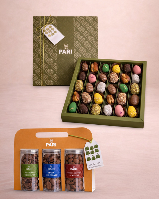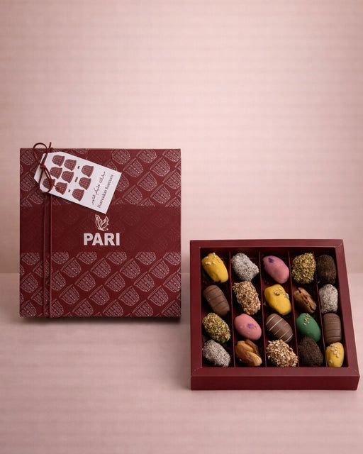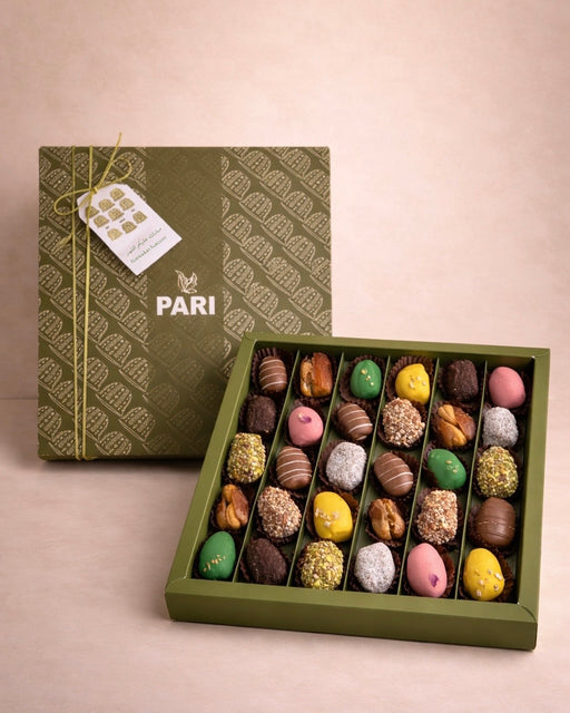 30 pieces of premium dates stuffed with almonds and coated in chocolates or nuts. Box Size: 30.5cm x 30.5cm