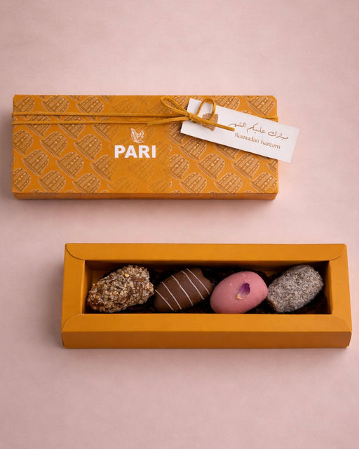 4 pieces of premium dates stuffed with almonds and coated in chocolates or nuts. Box Size: 21.5cm x 8cm