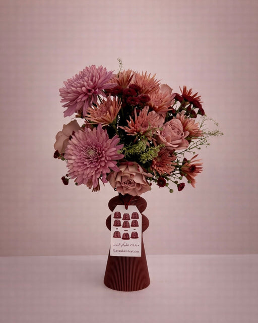 Fresh flower arrangement on a burgundy plastic vase along with Ramadan tag. Approximate Size: