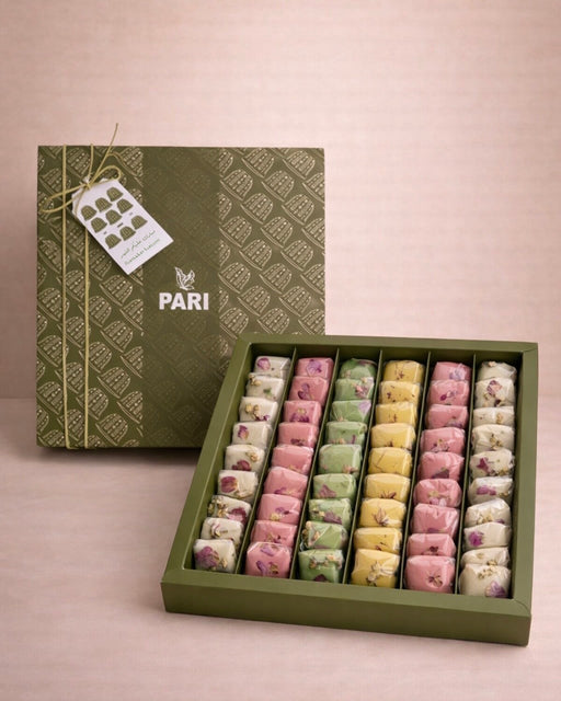 Our Finyal medium box filled with 28 pieces of Sesame white Chocolate Rose, Rose Croquant, Saffron Pistachio Croquant or 16 pieces of premium dates...