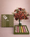 Our Finyal Large box filled with 50 pieces Sesame white Chocolate Rose, Rose Croquant, Saffron Pistachio Croquant or 30 pieces of premium dates along with majlis flowers