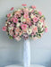 Fresh flower arrangement consisting of roses, spray roses, astromelia and gerbera on a stripped white plastic vase.